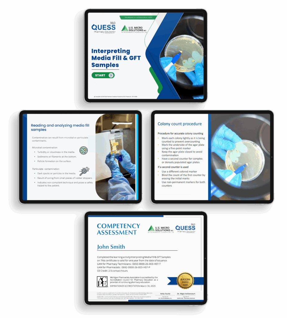 Interpreting Media Fill & GFT Samples Online Training, developed by QUESS 360 – Pharmacy Solutions in collaboration with U.S. Micro-Solutions, Inc., is the first online program to include a competency assessment specifically designed for personnel responsible for interpreting media fill and gloved fingertip sample results.